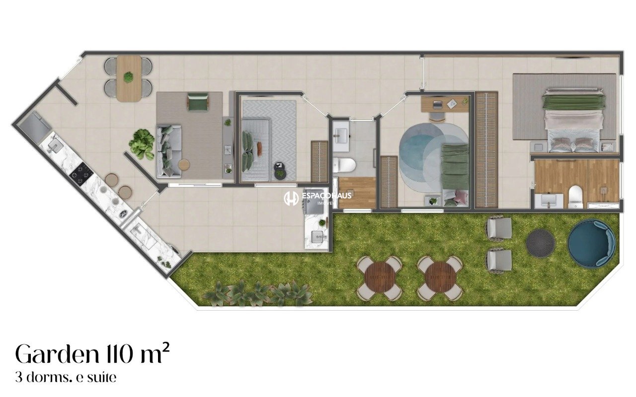 Plantas generosas ampliam a sensação de viver bem, reforçando o conceito integrado e a experiência de estar em família com sofisticação e conforto.