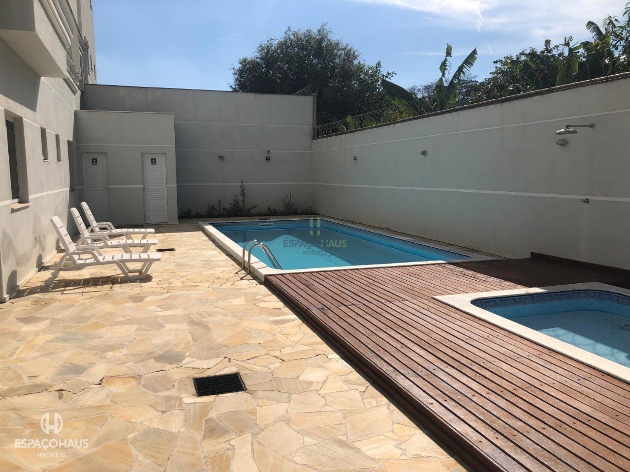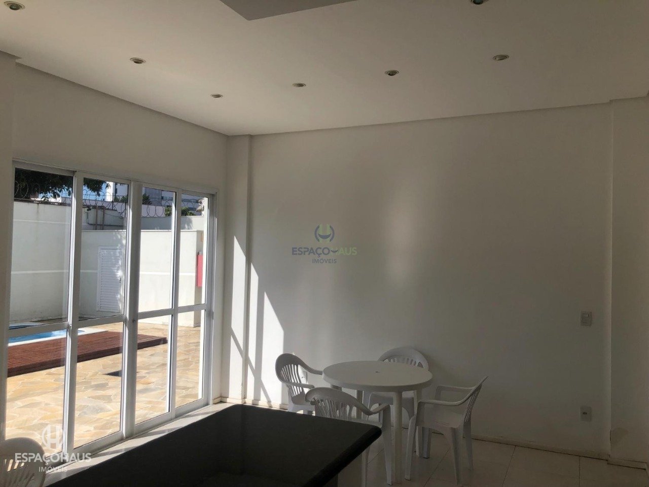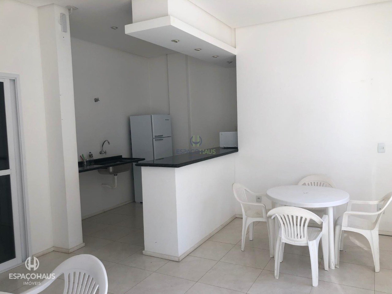 O condomínio conta com piscina, portaria 24 horas, churrasqueira e salão de festas.