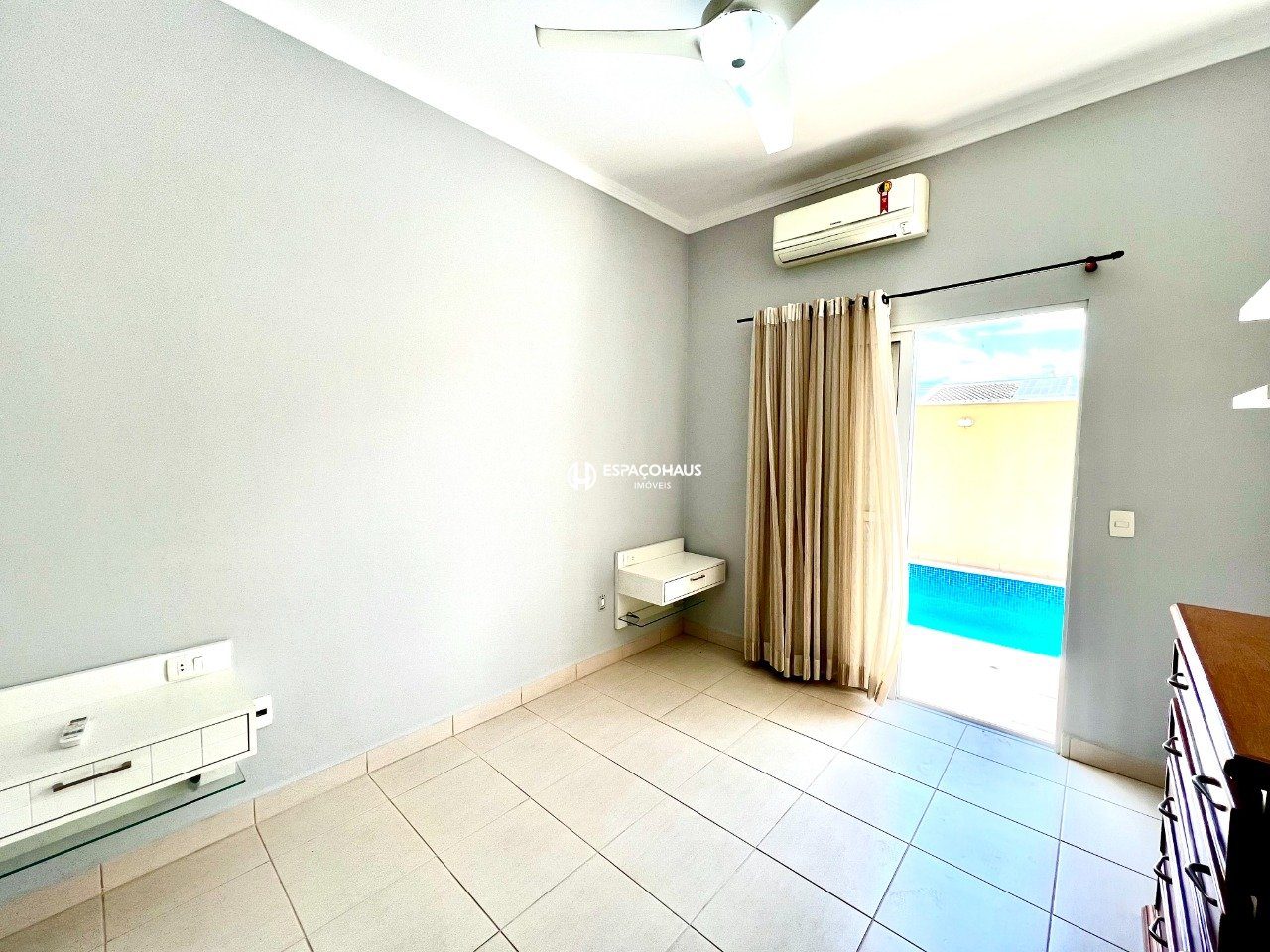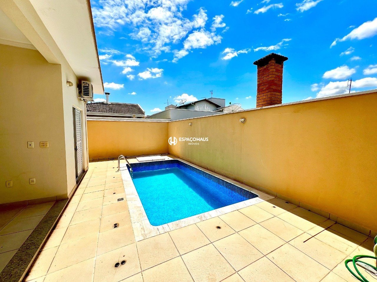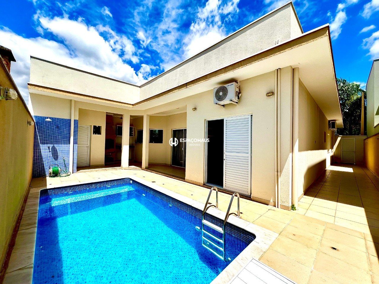 Casa térrea de 3 dormitórios, sendo 1 suíte com closet e ar-condicionado, e um dos quartos com armários planejados e ar-condicionado, sala ampla para dois ambientes, cozinha planejada, lavanderia com armários, quintal com espaço gourmet e uma bela piscina, além garagem para 4 carros sendo 2 cobertas.