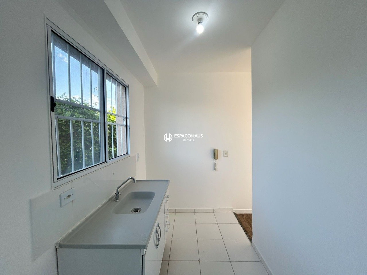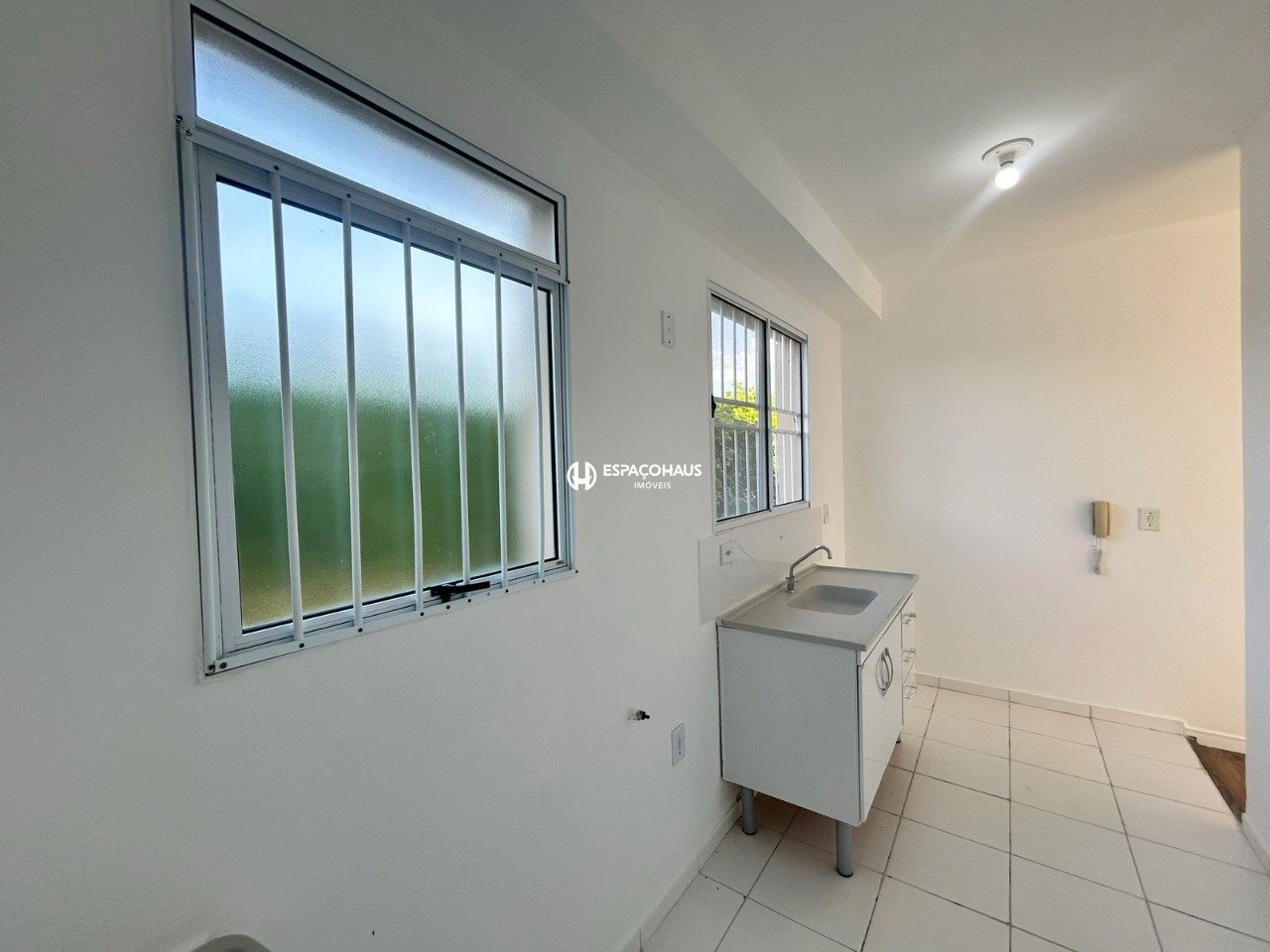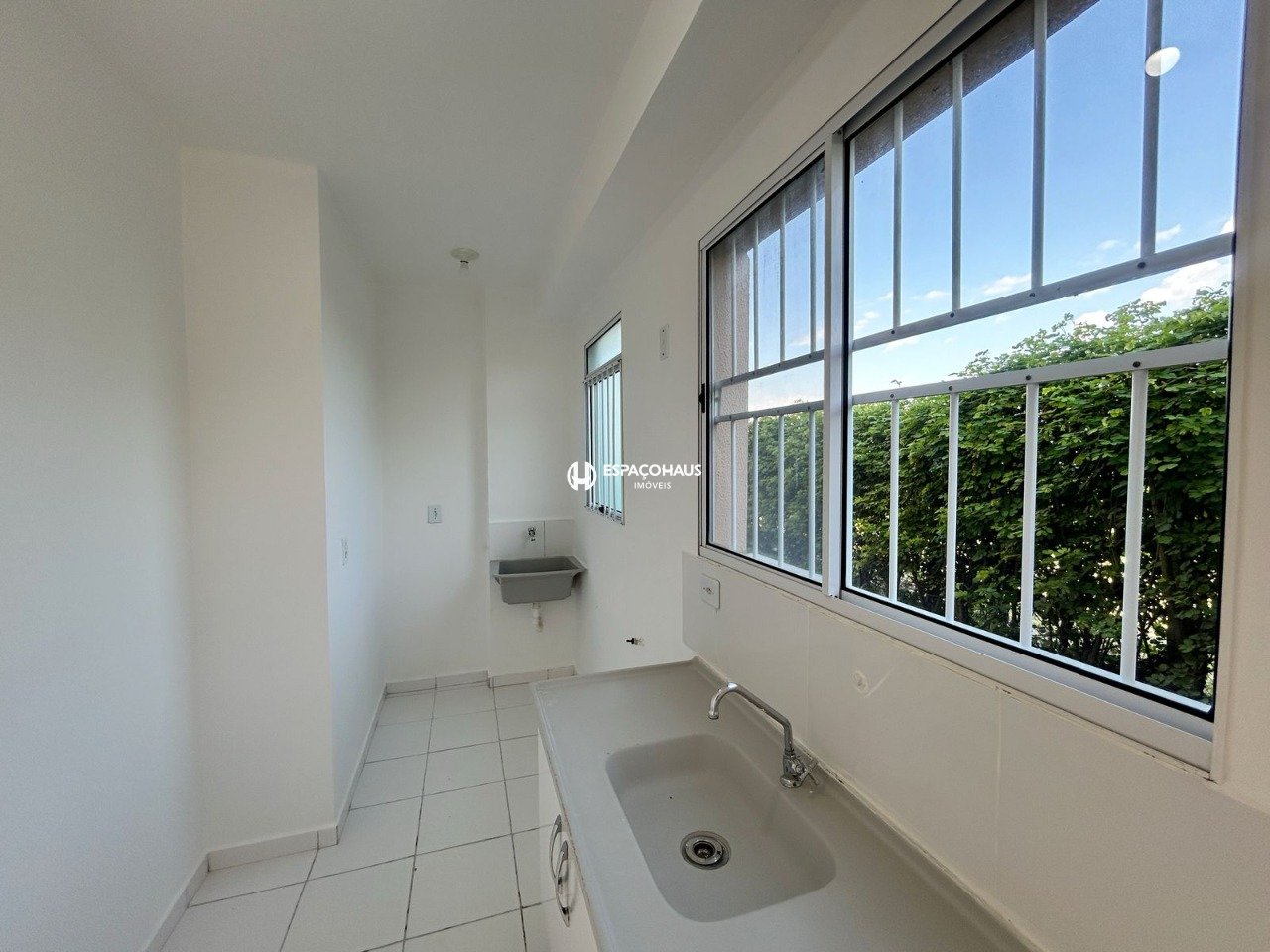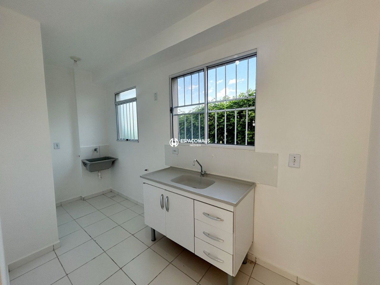 Apartamento térreo de 2 quartos, sala, cozinha com pia e gabinete, área de serviço, banheiro social e 1 vaga de garagem coberta.