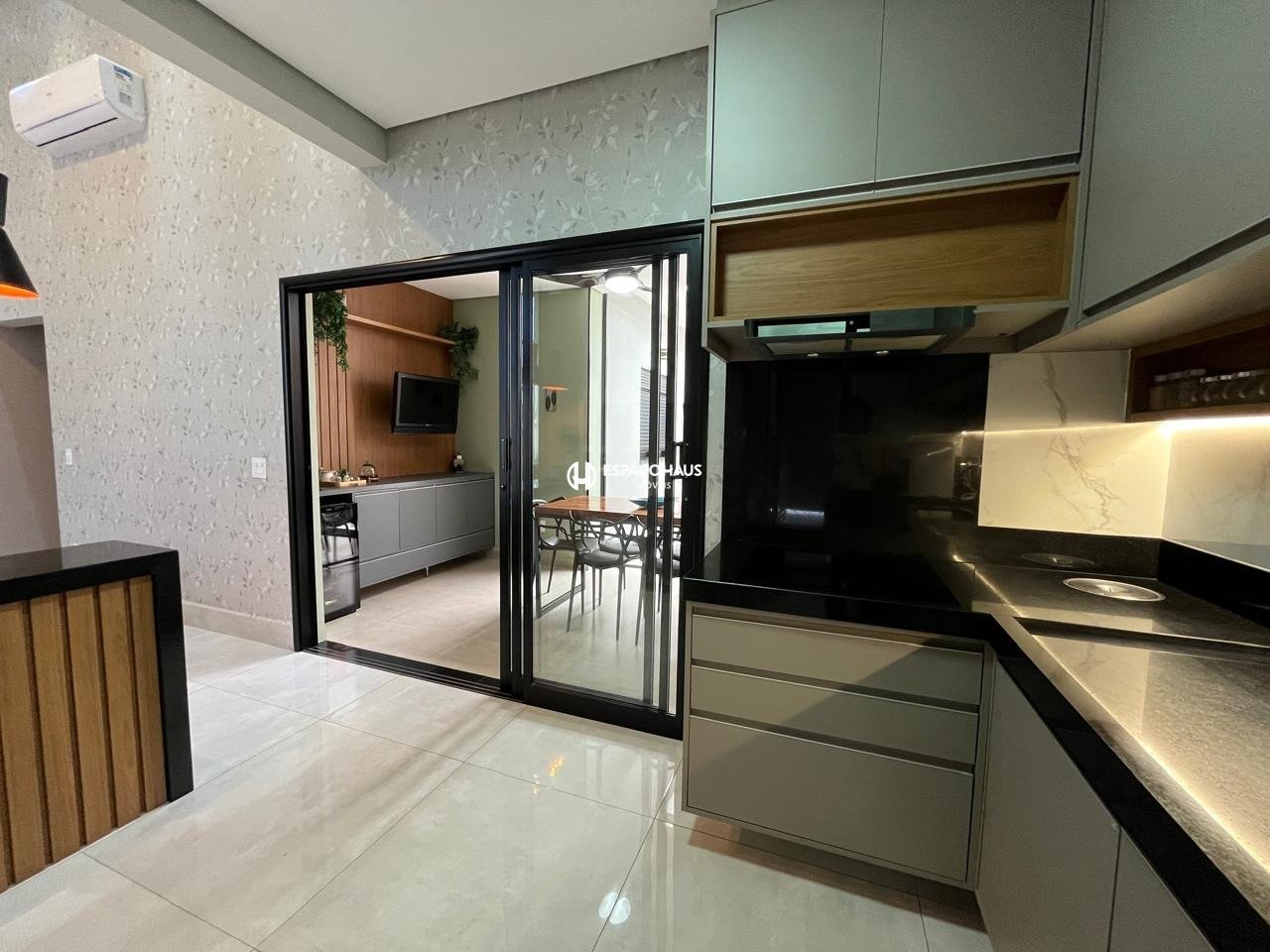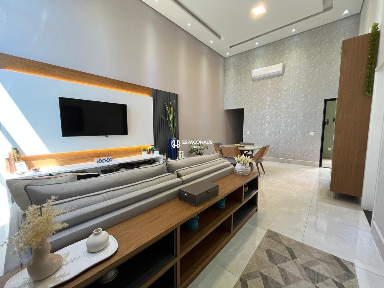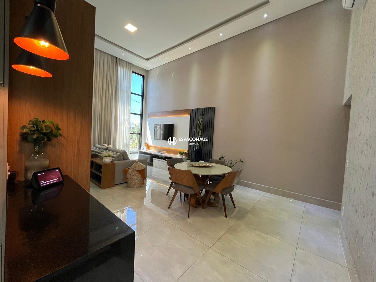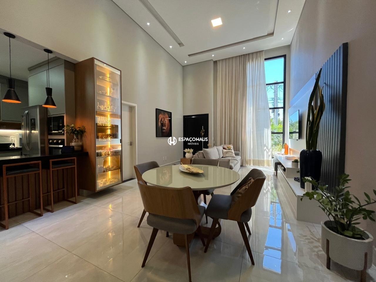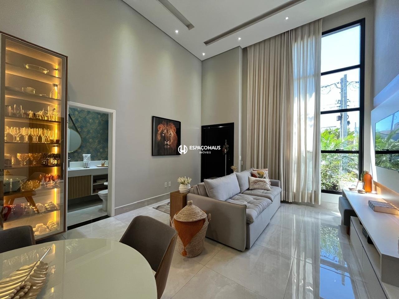 Sala com pé-direito duplo, pele de vidro, ar-condicionado, cristaleira, painel de TV e iluminação em LED