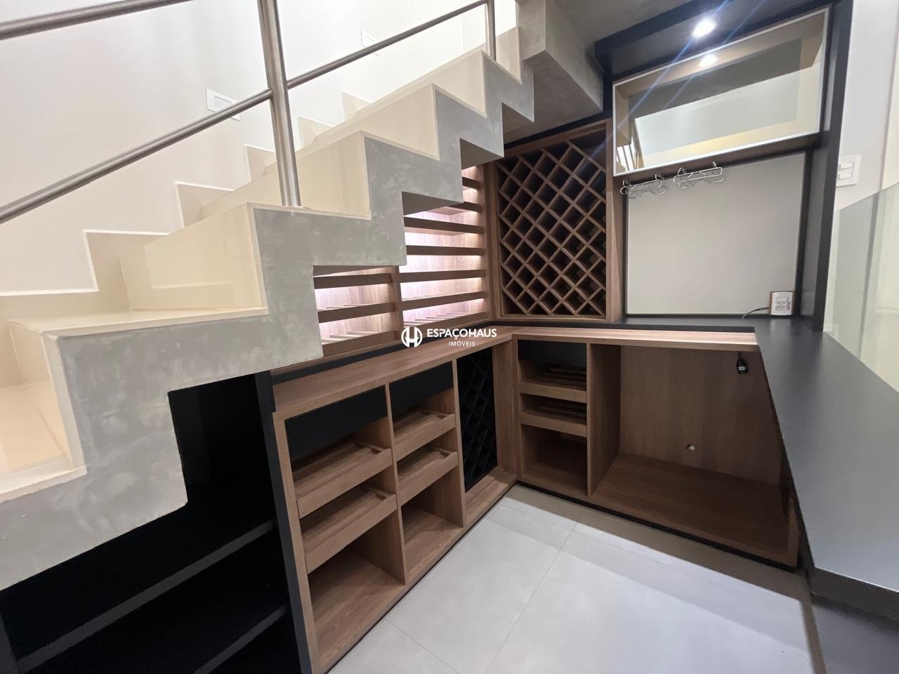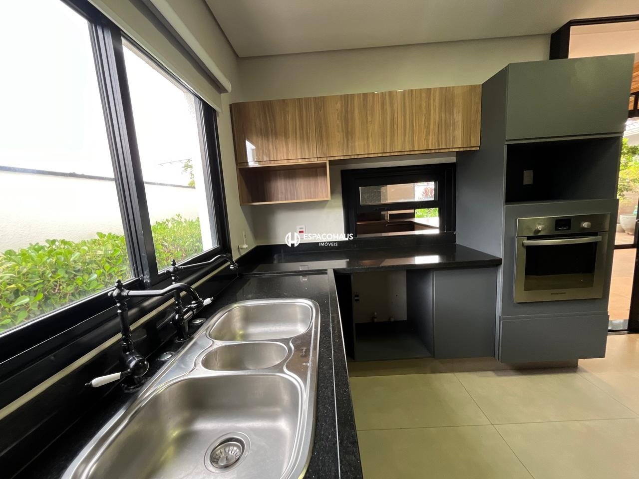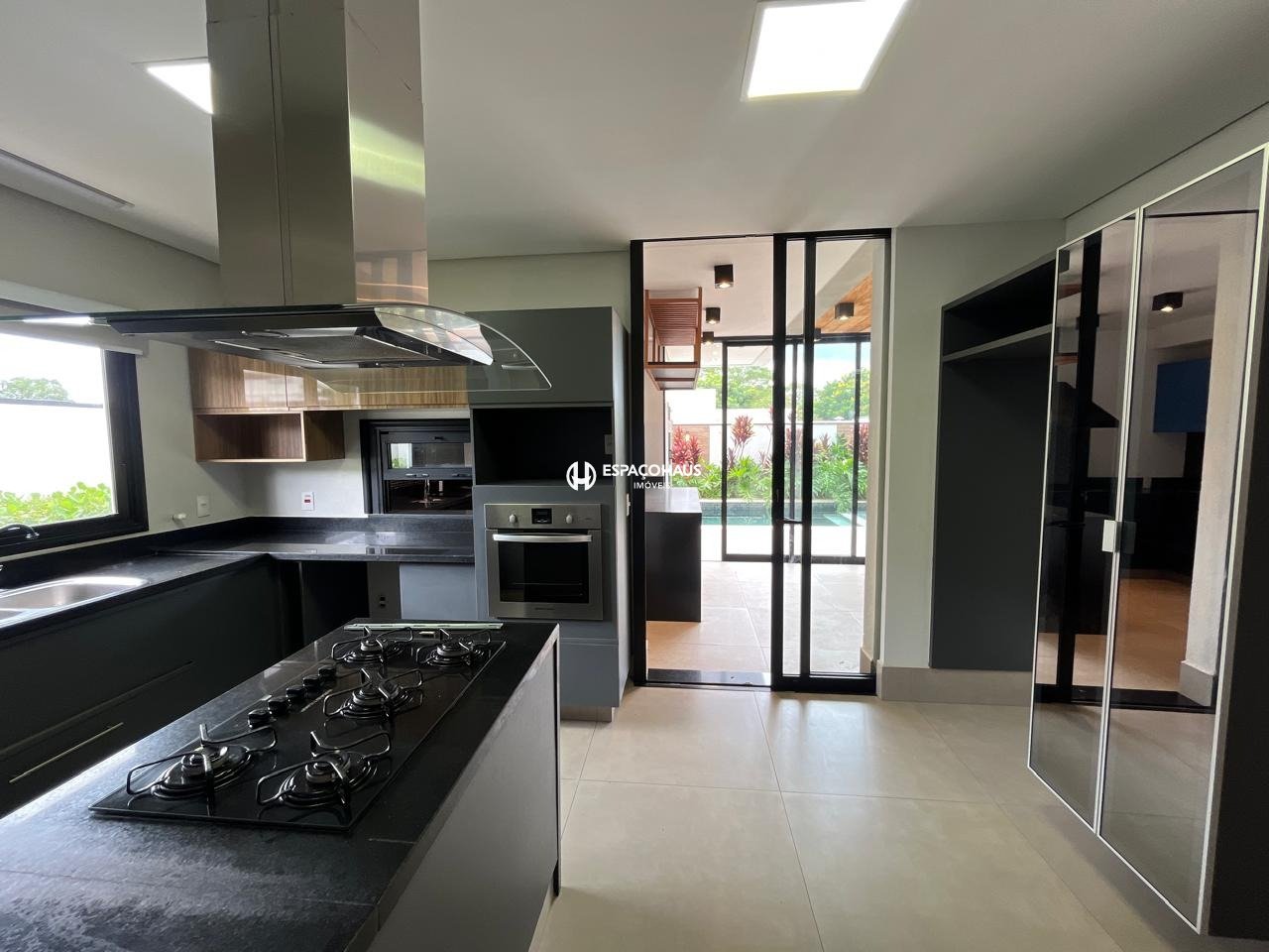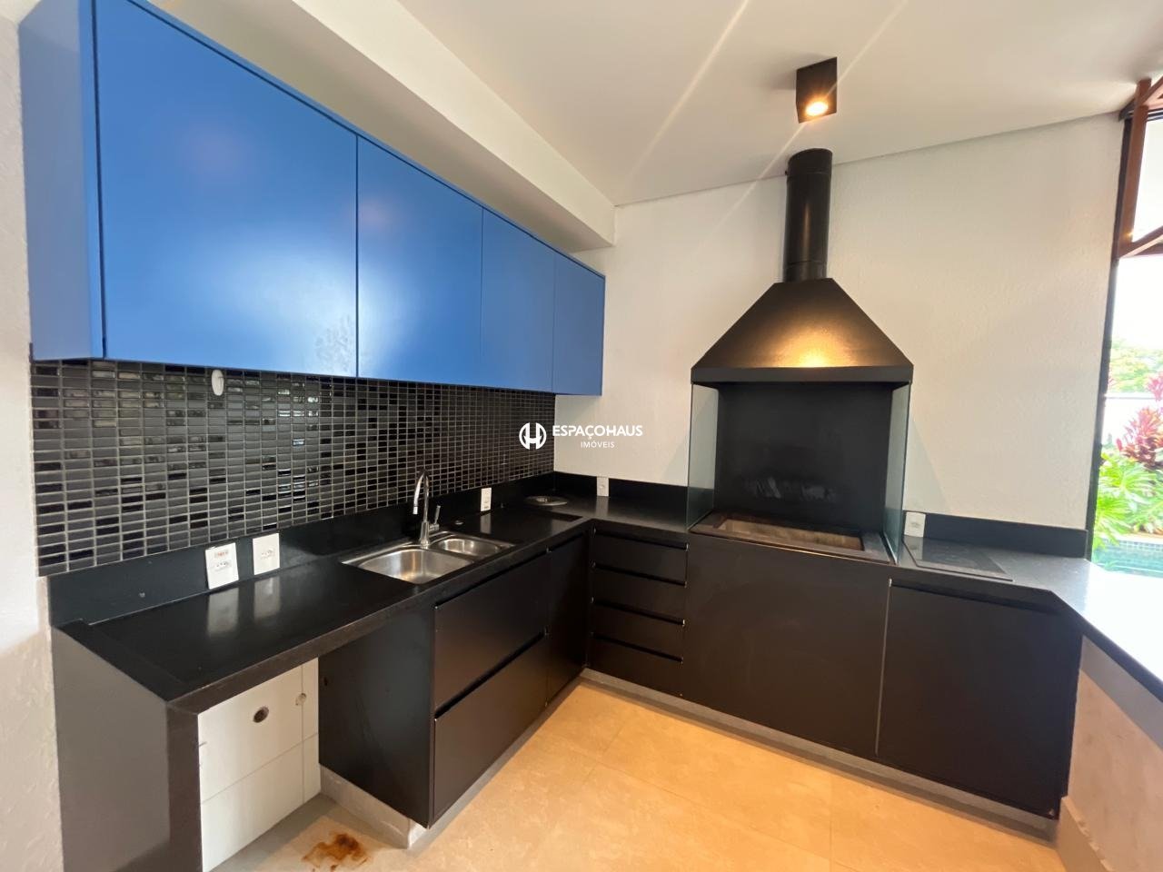 A cozinha é equipada com cooktop, coifa, forno embutido e passa-prato, integrando com a área gourmet.