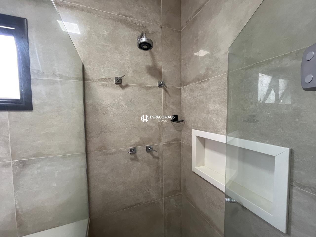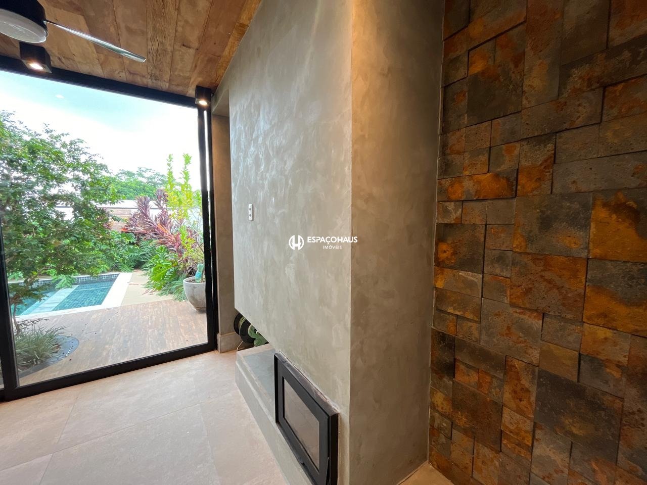 A sala para dois ambientes possui pé-direito duplo, garantindo amplitude e iluminação natural. A área gourmet conta com lareira, churrasqueira e armários planejados.