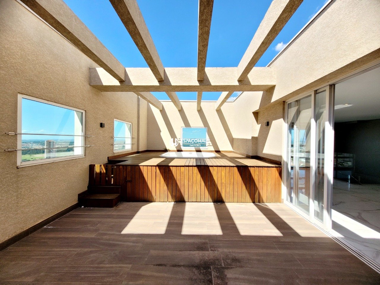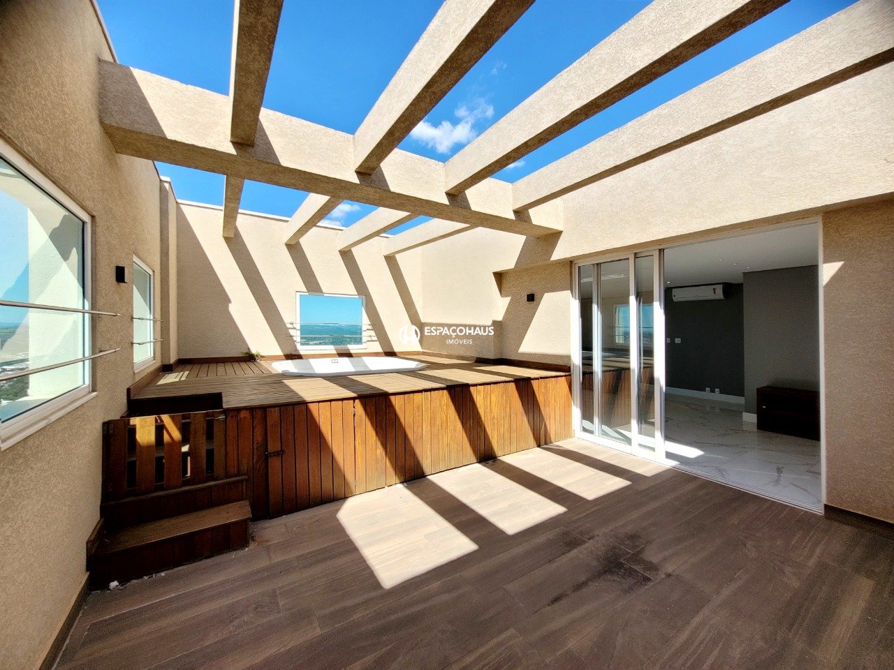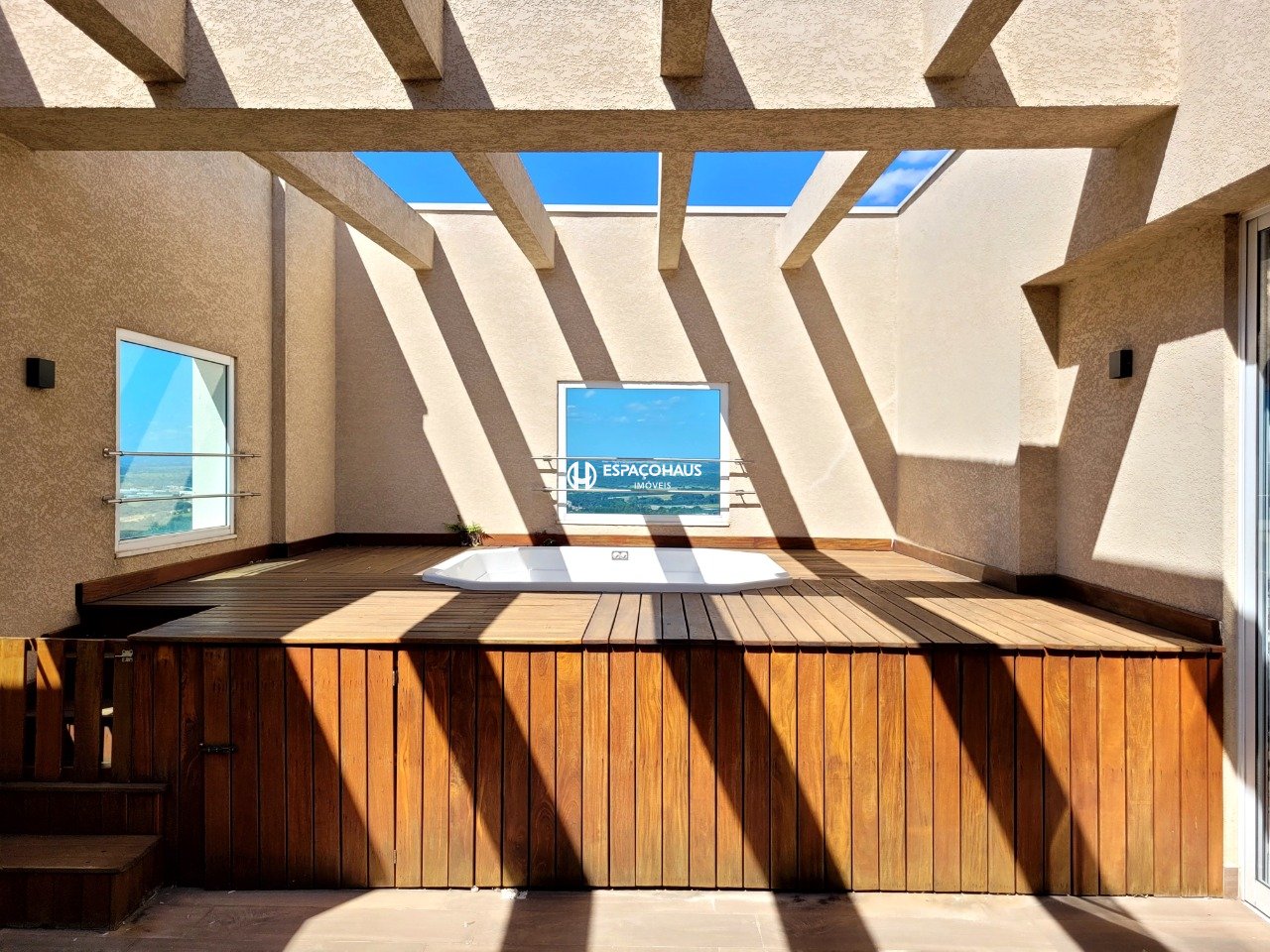 - Deck de madeira com banheira de hidromassagem jacuzzi.