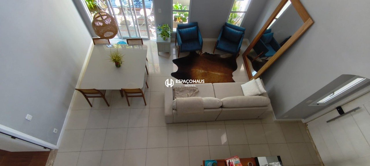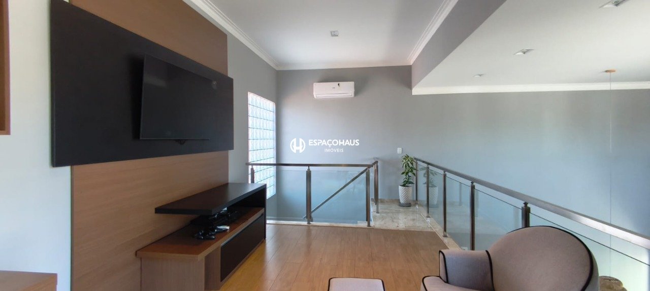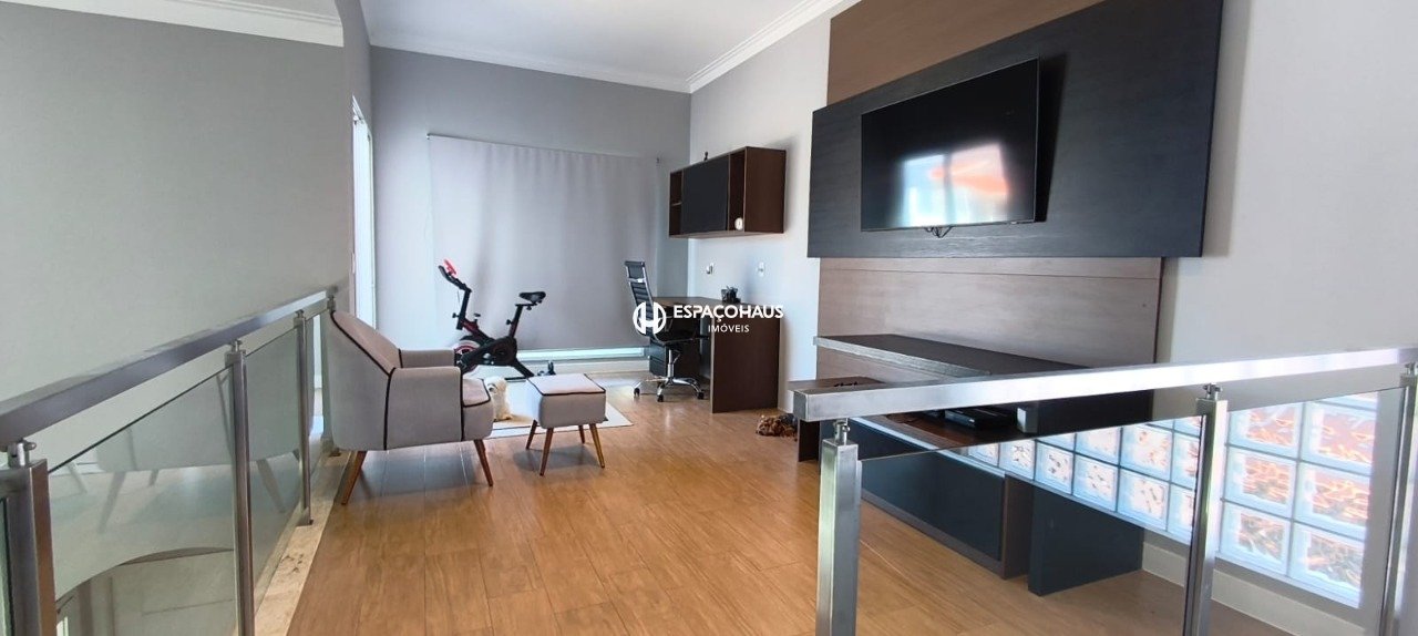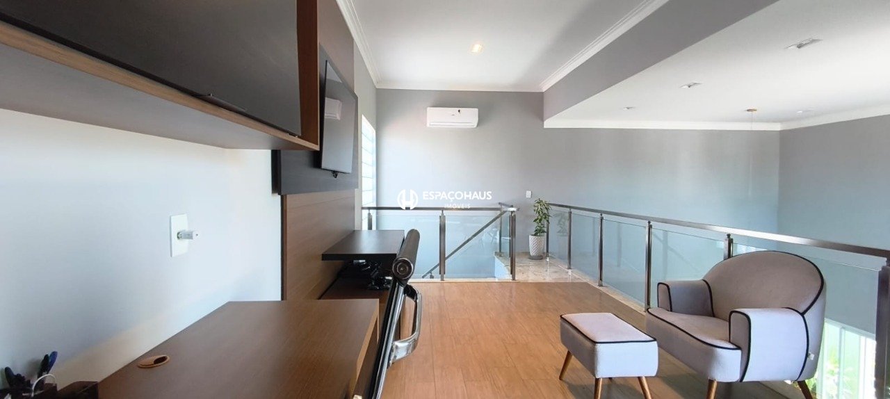 Mezanino aconchegante com sala de TV e espaço ideal para home office