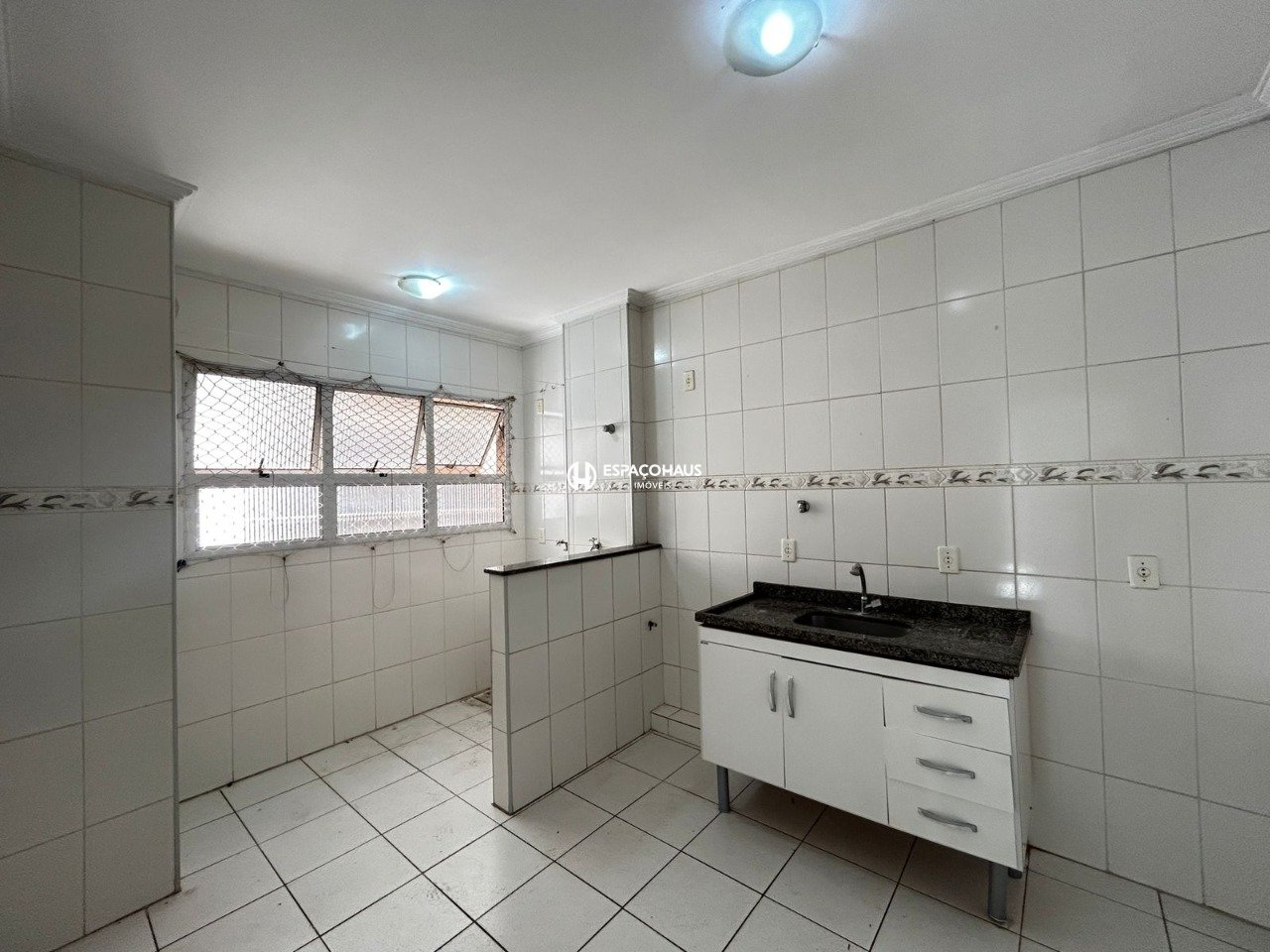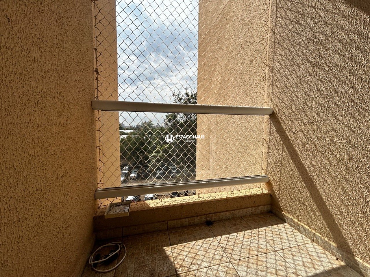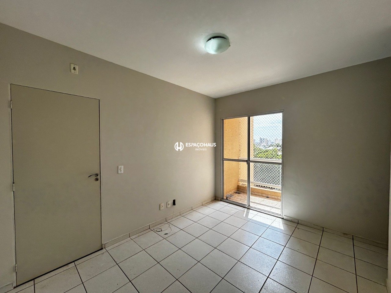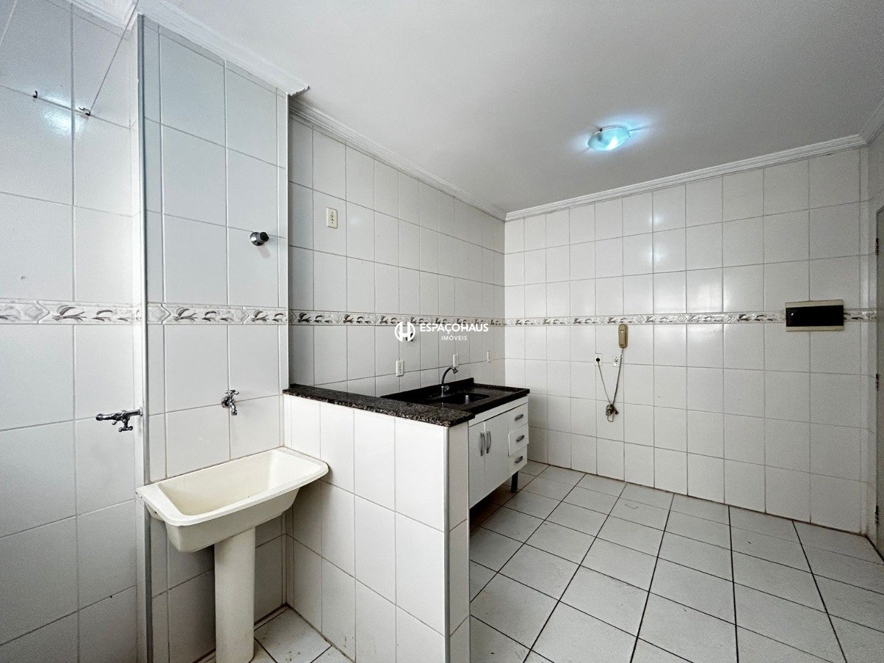 Apartamento de 67m² com sala com sacada, 02 quartos, cozinha com gabinete e mesa, área de serviço e banheiro.