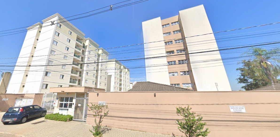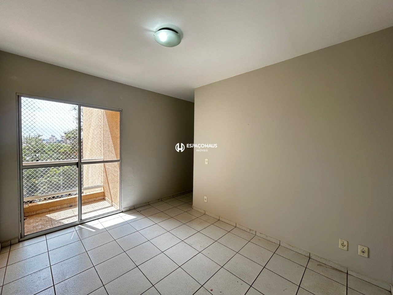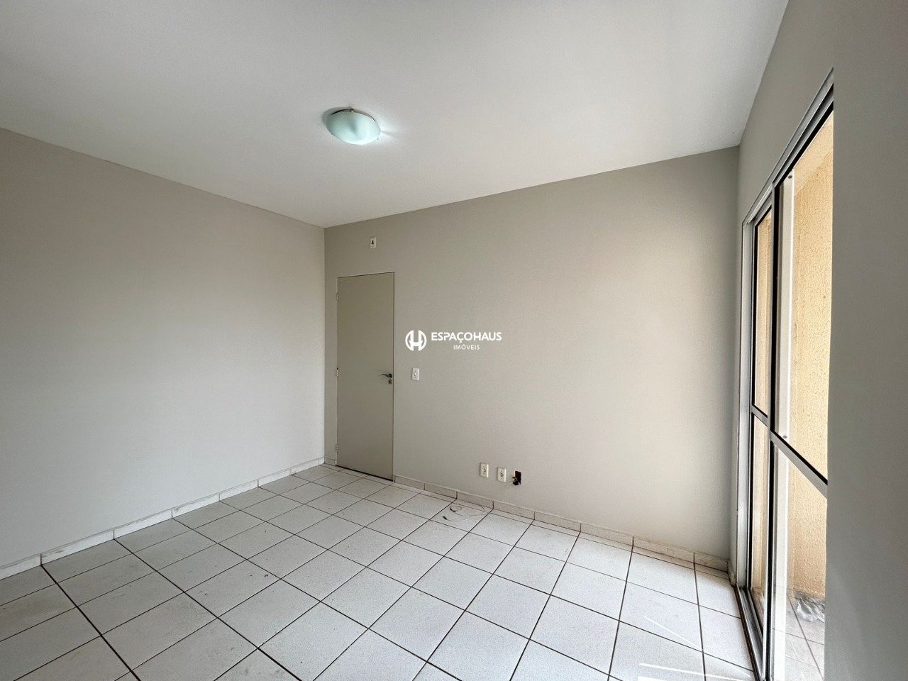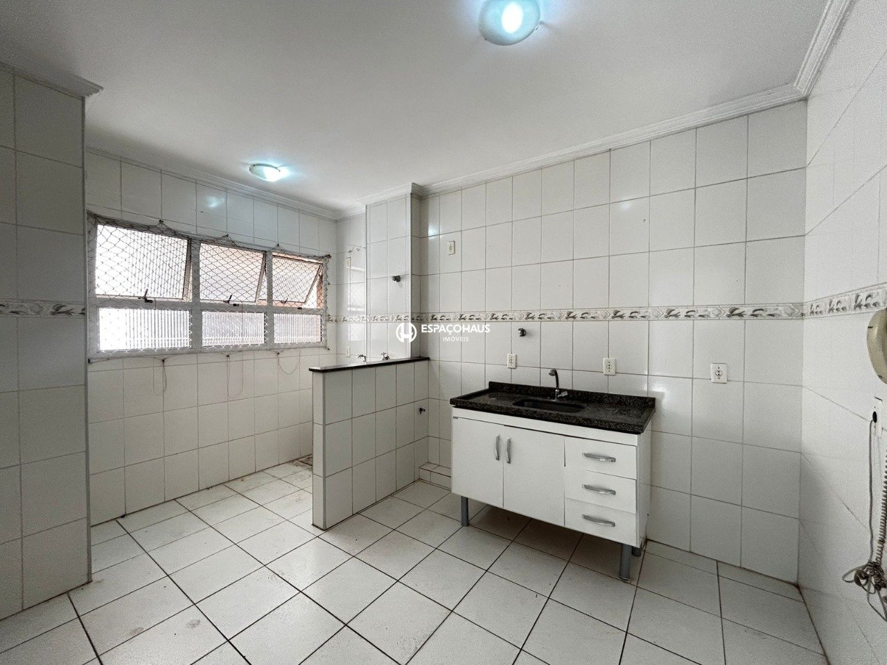 Apartamento de 67m² com sala com sacada, 02 quartos, cozinha com gabinete e mesa, área de serviço e banheiro.