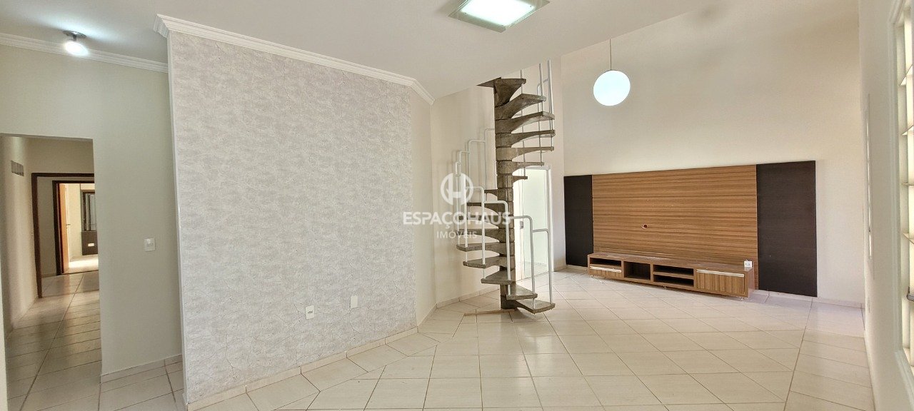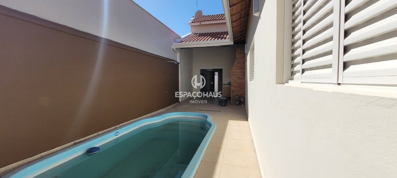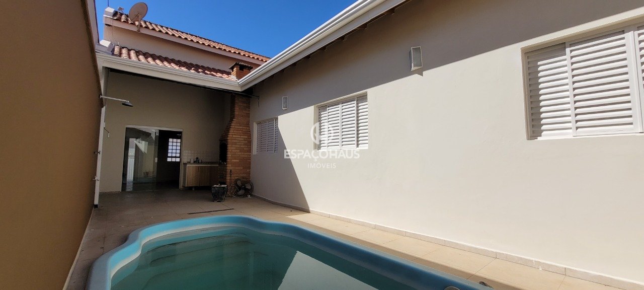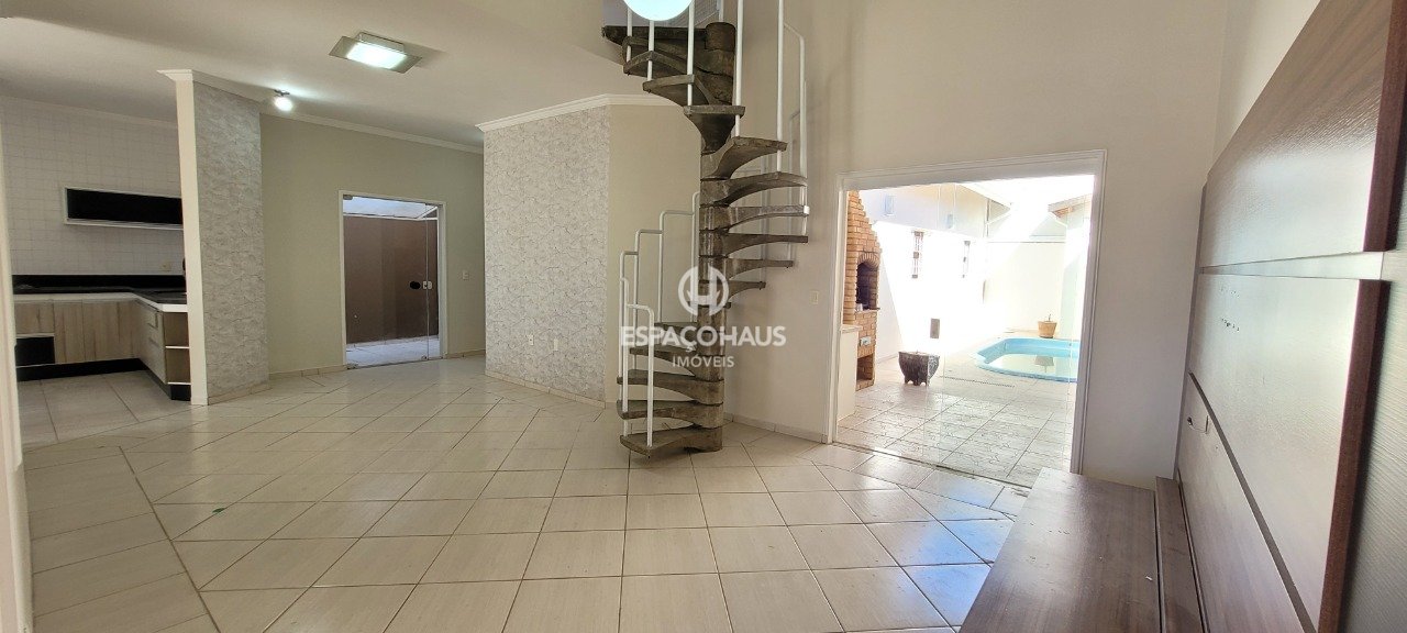 Casa com 3 quartos, sendo 01 suíte com closet e ar condicionado, 1 dos outros 2 quartos com planejados, sala para dois ambientes, lavabo, cozinha planejada, área de serviço com armários. quintal com espaço gourmet e piscina, chuveirão e banheiro externo, garagem para 4 carros e mezanino, que pode ser utilizado para sala de tv ou até um escritório.